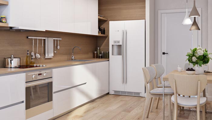 Высокая температура негативно влияет на его работу. Газовая плита должна находиться возле газовой трубы, в то время как ящики для посуды и столовых принадлежностей – недалеко от мойки. Такое рациональное расположение позволит сэкономить место на кухне, и хозяйке не придется бегать с мокрыми тарелками и вилками из одного конца кухни в другой.